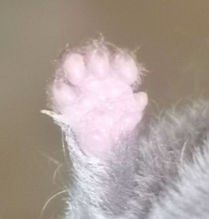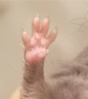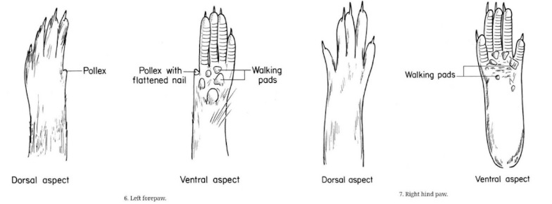 Zauważ wszystkie elementy zdrowej łapki. Wyróżniamy kciuk od wewnętrznej strony i 5 większych poduszek - trzy na górze i dwie na dole. Kciuk i palce są ułożone podobnie jak u ludzi.