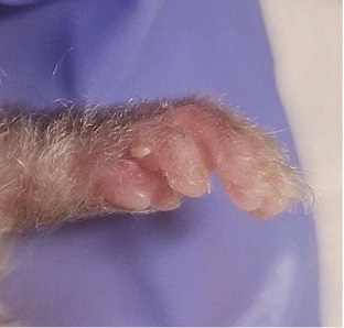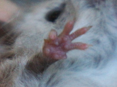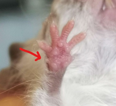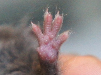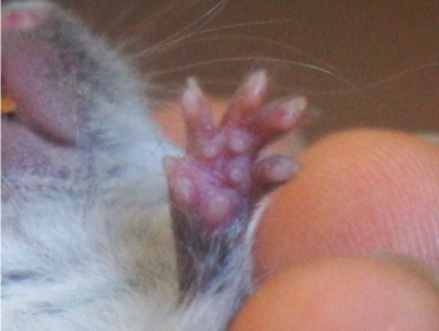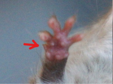 Kolejna mysz ma narośl tylko na prawej łapie. Widoczny jest dodatkowy palec (zaznaczony strzałką), który ma bardzo specyficzny kształt i występuje na zewnętrznej stronie łapy.