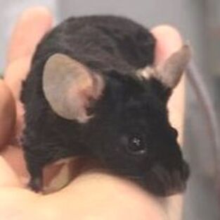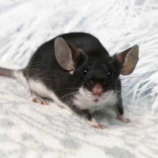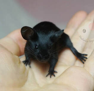 Typowa czarna myszka, nieselekcjonowana na ciemny kolor. Widzimy szczególną różnicę w odcieniu uszu, ogona i palców.