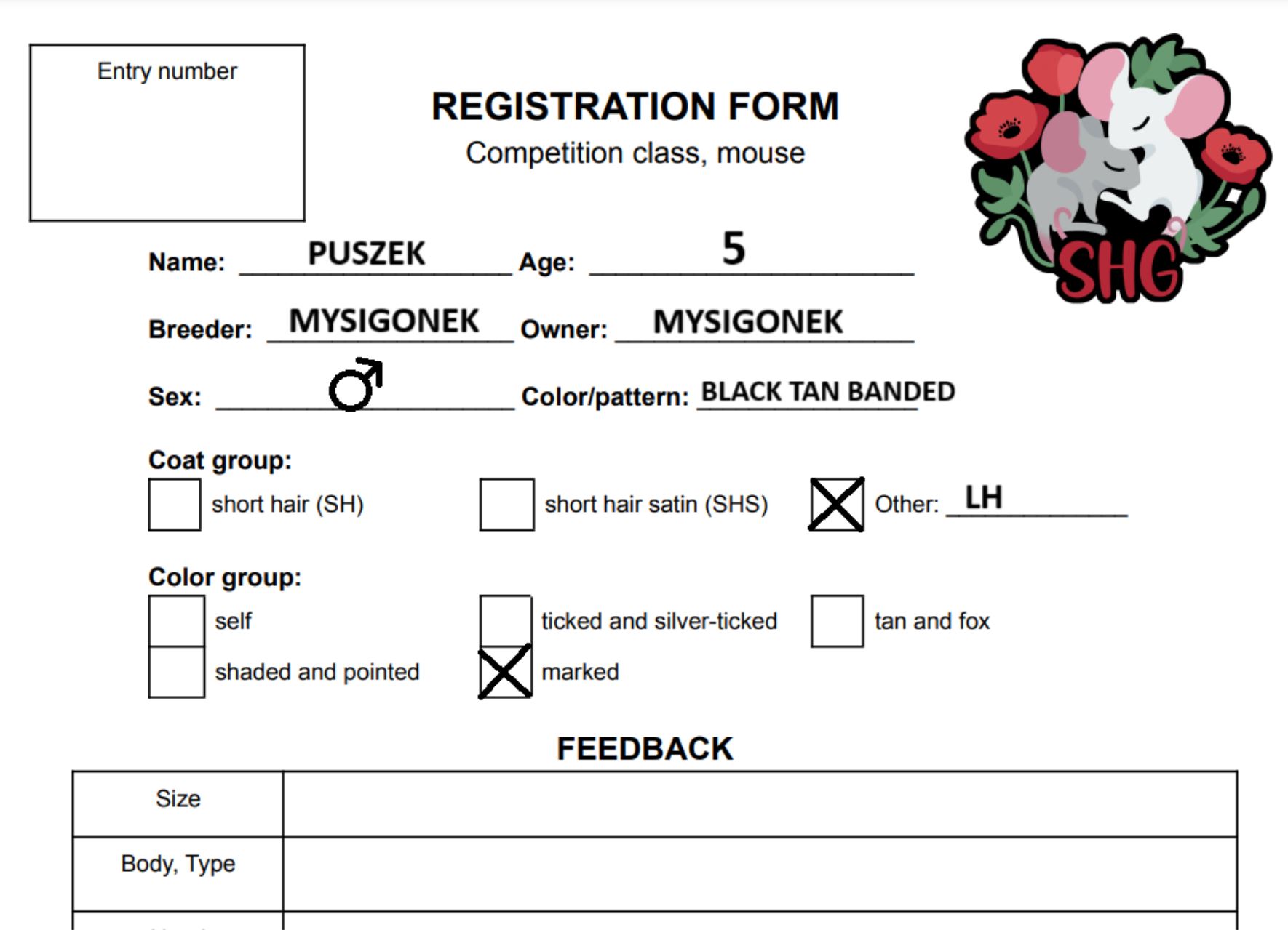 Owner: Nazwa hodowli aktualnego opiekuna myszy (jeśli masz hodowlę i wystawiasz mysz hodowlaną, nie podawaj imienia i nazwiska, nazwa Twojej hodowli wystarczy). W przypadku braku hodowli, podaj swoje imię i nazwisko.