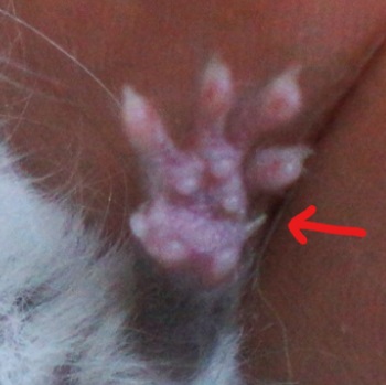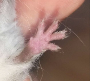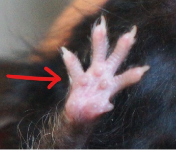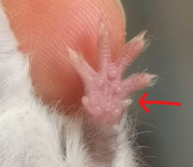 Kolejna mysz ma narośl tylko na prawej łapie. Widoczny jest dodatkowy palec (zaznaczony strzałką), który ma bardzo specyficzny kształt i występuje na zewnętrznej stronie łapy.